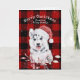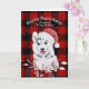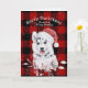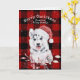 Chien Husky avec casquette du Père Noël en flocons de neige sur le buffle rouge et noir plaid. Le texte peut être modifié ou supprimé.
