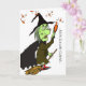 Nos Galan Gaeaf, carte de voeux en papier d'Halloween gallois. Illustration de dessin d'une sorcière verte tenant une potion orange et chevauchant un balai. Carte de voeux Welsh Halloween ou All Hallows Eve. Texte à l'intérieur : "applaudissez/bonne santé... soyez en sécurité." Copyright © Shoaff Ballanger Studios.