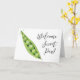 Jolie carte de voeux pour bébé avec une illustration tirée à la main d'un pois vert aux visages mignons. Le texte dit : "Bienvenue, pois doux !"