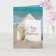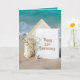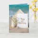 Une carte blanche est élégamment dressée sur un fond de plage, accompagnée de délicates fleurs blanches de gypsophila, d'une étoile de mer et d'un dollar de sable pour un 25e anniversaire de mariage. Le texte intérieur peut être modifié.
