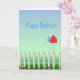 Dessin d'une scène de pays avec une clôture blanche, des tulipes, une volière rouge et deux oiseaux bleus pour souhaiter à quelqu'un le bonheur sur leur anniversaire. Vous pouvez éditer le texte intérieur comme désiré.