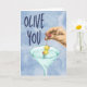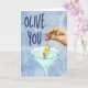 Cette carte de voeux comporte un portrait aquarelle de la main d'une femme en remuant un martini sale avec la légende "olivez-vous".