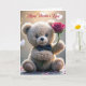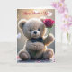 Un ours en peluche et une cravate à arc noir se dresse sur une seule rose rouge à longue tige entourée de formes cardiaques douces et brillantes. Tout le texte peut être modifié.