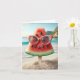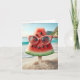 Une pastèque en lunettes de soleil se dresse dans le sable de la plage.
