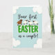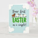 This greeting card features a soft pastel blue background like a clear spring sky, setting a gentle scene for two people celebrating together 🌷. Near the center, the message reads “Your first EASTER as a couple!” with “Your first” and “as a couple!” in flowing cursive-style lettering above and below. The word “EASTER” sits in large green letters with a white outline, drawing the eye and giving the design its main focus. Four simplified sheep-like animals rest along the tops of the green letters, leaning close as if sharing the moment like close friends 🐰. Three have creamy white wool, while one is warm brown, adding a small contrast that makes the group feel cozy and connected. Their round eyes and minimal features give them a sweet, calm look, like they’re quietly cheering the couple on. Pale, cloud-like shapes float in the corners, framing the text against the airy blue background. The green “EASTER” lettering is thick and outlined in white, with the animals perched evenly across the tops of the letters.