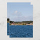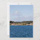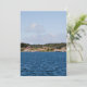 Paysage côtier suédois avec eau bleue et ciel et chalets rouges et un bateau. Photographie.