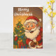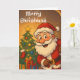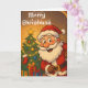 Détendez les fêtes avec cette carte de Noël Père Noël délicieuse avec un joyeux Père Noël dans son emblématique costume rouge, avec une barbe blanche et un sourire joyeux. Le design présente Père Noël debout à côté d'un sapin de Noël joliment décoré, orné de décorations colorées, de lumières scintillantes et d'une étoile brillante. Un bas douillet et des cadeaux enveloppés ajoutent à la scène festive, dressés contre un arrière - plan d'or chaleureux.