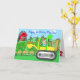 Cette jolie carte dessinée à la main, présente un petit garçon à cheval dans un tracteur avec le thème d'un garçon général d'outils, tracteurs, camions et voitures.