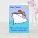 Customisez l'avant et l'intérieur pour votre propre usage. Idéal pour les bons souhaits de voyage, les invitations de réunion avant la croisière, les envois d'agents de voyage, et plus encore. Un bateau de croisière naviguant en mer lisse sous un ciel ensoleillé est une excellente façon de dire "Croisière !" NOTEZ que si vous ne souhaitez AUCUN texte personnalisé, vous devez effacer les exemples de mots que vous ne souhaitez pas imprimer.