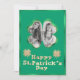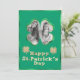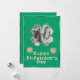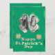 Cette carte de vœux personnalisée de la Saint-Patrick présente un cadre photo de trèfle chanceux sur fond vert. Le cadre présente des paillettes dorées et un design en feuille verte. Une photo échantillon est placée à l'intérieur, que vous pouvez personnaliser pour inclure votre propre photo ou autre image. Le vœu Joyeuse Saint-Patrick est imprimé dans une police bulles assortie en feuille verte et paillettes dorées. Deux trèfles sont placés de chaque côté.