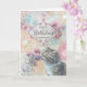 Carte d'anniversaire pour petite-fille avec un petit chaton sucré sentant un bouquet de fleurs, entouré d'un collage d'autres éléments floraux et aquarelle et des marques blanches d'encre.
