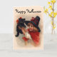 L'art vintage délicieux comporte une petite fille de sorcière dans le casquette noir aigu et le cap rouge avec son chaton noir mignon. Le texte heureux de Halloween peut être customisé par vous.