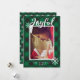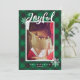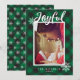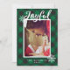 Cette carte de Noël photo présente votre photo de famille préférée, le mot "Joyeuse" en blanc dans une typographie manuscrite sur un fond à carreaux vert confortable accentué de flocons de neige blancs. Personnalisez avec le nom de votre famille. Le verso montre un motif à carreaux vert avec des flocons de neige blancs partout.