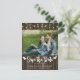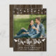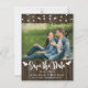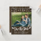 Couple photo Save the Date mariage carte faire-part avec informations sur le site, grange bois brun avec police blanche.
