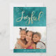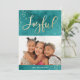 Célébrez les vacances avec les amis et la famille en leur envoyant un carte photo chic de vacances d'aquarelle ! Les cartes photos faits sur commande de vacances comportent un arrière - plan turquoise d'aquarelle, le mot "joyeux" dans une police à la mode de manuscrit, des accents de feuille d'or de faux, et des textes d'attente pour votre photo et texte faits sur commande. Le dos du carte photo comporte un arrière - plan barré par aquarelle.