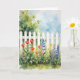 A white picket fence with flowers adorn this card. Text inside can be changed. Image is AI-generated by IveyCottage.