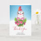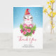 Carte de remerciements au design mignon et fantaisiste avec un adorable pingouin portant un chapeau de santa rouge. Derrière un bouquet de fleurs aux sucres de canne rayés roses et blancs. Un arrière - plan d'hiver enneigé avec des flocons de neige tombant.