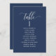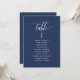 Aidez vos invités à trouver leur table avec cette élégante carte moderne de plan de salon avec les noms des invités. Cartes recto-verso pour que les clients puissent chercher leur nom à l'avant ou à l'arrière. Libérez de l'espace tout autour en vous donnant la liberté d'utiliser des clips ou un trou de perforation pour accrocher des écrans, ou d'utiliser le support/cadre de table. Arrière - plan bleu marine et texte blanc. Détails de calligraphie manuscrite moderne. Plusieurs options de couleur. Ayez tous les numéros de table dans la même couleur ou mélangez les couleurs selon le thème de couleur de votre événement. Une partie de notre collection "Berry, Blue and Burgundy Floral".