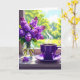 Une magnifique carte de voeux fleurie pour faire savoir à un ami ou à un membre de la famille que vous y pensez. Une jolie illustration d'un vase de lilas violets dans un vase en verre et une tasse de café chaude assise sur un rebord de fenêtre.