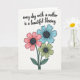 This card features a digital illustration of three stylized flowers arranged from the lower left on a bright white background, with a gentle, affectionate mood ❤️. The blooms lean slightly toward one another like close friends, creating a cozy little cluster that feels quietly caring. One flower is coral pink, one is soft sky blue, and one is muted sage green, each outlined with dark lines that keep the shapes crisp and easy to read. In the center of every blossom sits a deep charcoal-gray circle with a small white spiral detail that adds a tender, intimate touch. Thin stems and deep forest-green leaves stretch upward, giving the bouquet a calm, grounded look. Above the flowers, the message “every day with a mother is a beautiful blessing” appears centered in black lettering, spaced comfortably so it feels airy and open 🌼. The text sits in the upper half of the layout while the bouquet stays anchored in the lower left, and the petals show dark centers with white spiral marks.