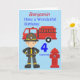 Conception amusante d'un sapeur-pompier avec le camion de pompiers et la borne d'incendie. Cette carte serait une carte amusante à envoyer à tout enfant qui a un anniversaire et qui aime jouer avec les camions et les figurines. L'âge sur le devant et l'âge sur le casque peuvent être modifiés à un âge différent, le nom en haut de la carte et le message à l'intérieur, qui se lit "Joyeux Anniversaire ..... Passez un excellent moment.... avec amour de ...." peuvent être modifiés pour personnaliser la carte.