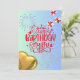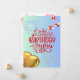 Avant : La carte a un arrière - plan bleu clair. Au centre se trouve un grand texte rouge qui dit "Joyeux anniversaire à vous", décoré d'étoiles blanches et rouges. Au-dessus du texte, il y a deux feux d'artifice blancs, et dispersés autour sont de petites étoiles. A droite, il y a deux boîtes-cadeaux avec des rubans rouges, et en bas à gauche, il y a un ballon en forme de coeur doré. Retour : Il y a une boîte à cadeaux et un ours en peluche à imprimer de manière légère, ainsi que les expressions "nous vous souhaitons le meilleur" et "faites un voeu et fêtez votre journée spéciale" dans une police élégante.