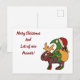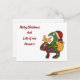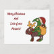 Un oiseau mignon comme une créature portant un casquette du Père Noël chevauchant un renne. Le personnage porte un sac en forme de sac à dos avec des cadeaux de Noël et du cadeau, emballé dans du papier et des rubans colorés fantaisie. Texte dit "Joyeux Noël et beaucoup de beaux cadeaux !" Chaque fois que vous voulez rendre quelqu'un heureux avec une carte de Noël mignonne et légèrement différente.