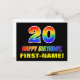 La façade de cette carte postale colorée, amusante et joyeuse à thème d'anniversaire comporte un grand nombre de "20" et le message "HAPPY BANTHDAY", tous deux ayant un dégradé arc-en-ciel coloré inspiré couleur motif, ainsi qu'un nom de destinataire personnalisable jaune gras. L'avant a aussi un arrière - plan noir clair. Le dos de la carte postale contient un message de voeux d'anniversaire personnalisable, ou peut-être peut-être effacé et laissé vide si un message doit être écrit à la main à la place. Une carte postale d’anniversaire personnalisable comme celle-ci pourrait être une façon amusante de reconnaître le vingtième anniversaire de quelqu’un. [~Z0000474]