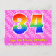 Le recto de cette conception de carte postale d'anniversaire joyeuse, heureuse et aimante présente un grand nombre "34" avec un motif inspiré d'un dégradé de spectre d'arc-en-ciel. Il comporte également le message "Joyeux 34e anniversaire" et un nom de destinataire personnalisé. Le recto présente en outre un motif rayé rose clair et rose foncé joyeux avec des formes de cœur. Le verso comporte un message de vœux d'anniversaire personnalisable, ou pourrait éventuellement être effacé et laissé vide si un message doit être écrit à la main à la place. Une carte postale d'anniversaire personnalisée comme celle-ci pourrait être un moyen amusant de célébrer le trente-quatrième anniversaire de quelqu'un. Des cartes postales comme celle-ci pourraient également être utilisées pour inviter des invités à une fête d'anniversaire ou à une célébration