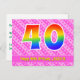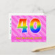 Le devant de cette conception de carte postale thématique d'anniversaire aimante, dynamique et amusante présente un grand nombre "40" avec un motif inspiré d'un dégradé de spectre d'arc-en-ciel. Il comporte également le message "Joyeux 40e Anniversaire" et un nom de destinataire modifiable. Le devant présente en outre un motif rayé rose foncé et rose clair joyeux avec des formes de cœur. Le verso comporte un message de vœux d'anniversaire personnalisé, ou pourrait éventuellement être effacé et laissé vide si un message doit être écrit à la main à la place. Une carte postale d'anniversaire personnalisée comme celle-ci pourrait être un moyen amusant d'envoyer un message pour célébrer le quarantième anniversaire de quelqu'un. Des cartes postales comme celle-ci pourraient également être utilisées pour inviter des invités à une célébration d'annivers