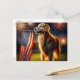 Un récupérateur d'or tenant un drapeau américain avec un feu d'artifice en rétroéclairage. Tout le texte peut être modifié.