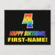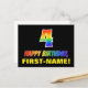 La façade de cette carte postale colorée, amusante et joyeuse sur le thème de l'anniversaire comporte un grand nombre de "4" et le message "HAPPY BANTHDAY", tous deux dotés d'une couleur motif inspirée du gradient de l'arc-en-ciel, ainsi qu'un nom de destinataire personnalisé jaune gras. L'avant est également orné d'un simple arrière - plan de couleur noire. Le dos de la carte postale a un message de voeux d'anniversaire personnalisable, ou peut être effacé et laissé vide si un message doit être écrit à la main à la place. Une carte postale colorée et personnalisable comme celle-ci pourrait être une façon amusante de célébrer le quatrième anniversaire de quelqu’un. [~Z0000474]