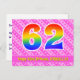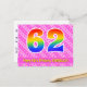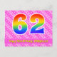 Le recto de cette carte d'anniversaire joyeuse, dynamique et amusante présente un grand nombre "62" avec un motif inspiré d'un dégradé de spectre d'arc-en-ciel, ainsi que le message "Joyeux 62e anniversaire," et un nom de destinataire modifiable. Le recto présente en outre un motif rayé rose clair et rose foncé joyeux avec des formes de cœur. Le verso comporte un message de vœux d'anniversaire personnalisé, ou pourrait éventuellement être effacé et laissé vide si un message doit être écrit à la main à la place. Une carte d'anniversaire personnalisable comme celle-ci pourrait être un moyen amusant de célébrer le soixante-deuxième anniversaire de quelqu'un. Des cartes postales comme celle-ci pourraient également être utilisées pour inviter des invités à une célébration d'anniversaire ou une fête organisée pour quelqu'un qui a