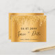 Une carte moderne et branchée Save the Date pour une fête de 70e anniversaire. Un faux arrière - plan en feuille métallique d'or décoré de faux gouttes de parties scintillant d'or. Devant : Personnalisez et ajoutez une date et un nom/âge 70. Lettres de couleur noire. Le texte : Save the Date est écrit avec un grand script de style à la main tendance. Retour : détails de votre fête.