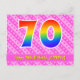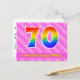 L'avant de cette carte postale joyeuse, dynamique et festive conçue pour un anniversaire présente un grand numéro "70" avec un motif dégradé de spectre arc-en-ciel. Elle comporte également le message "Joyeux 70e anniversaire" et un nom de destinataire personnalisable. L'avant comporte en outre un motif joyeux de cœurs et de rayures rose clair et rose foncé. Le verso comporte un message de vœux d'anniversaire personnalisé, ou pourrait éventuellement être effacé et laissé vierge si un message doit être écrit à la main à la place. Une carte postale d'anniversaire personnalisable comme celle-ci pourrait être un moyen amusant de célébrer le soixante-dixième anniversaire de quelqu'un. Des cartes postales comme celle-ci pourraient également être utilisées pour inviter des invités à une fête ou à une célébration organisée pour quelqu'un qui fête ses 70