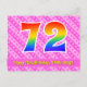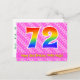 L'avant de cette conception de carte postale thématique d'anniversaire amusante, dynamique et affectueuse présente un grand nombre "72" avec un motif inspiré d'un dégradé de spectre d'arc-en-ciel. Il comporte également le message "Joyeux 72e anniversaire" et un nom de destinataire modifiable. L'avant présente en outre un motif rayé rose foncé et rose clair joyeux avec des formes de cœur. Le verso comporte un message de vœux d'anniversaire modifiable, ou pourrait éventuellement être effacé et laissé vide si un message doit être écrit à la main à la place. Une carte postale d'anniversaire personnalisable comme celle-ci pourrait être un moyen amusant de reconnaître le soixante-douzième anniversaire de quelqu'un. Des cartes postales comme celle-ci pourraient également être utilisées pour inviter des invités à une fête d'anniversaire organisée