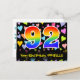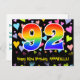 L'avant de cette carte d'anniversaire colorée, ludique et pleine d'amour présente un grand numéro "92" avec un motif dégradé de spectre arc-en-ciel. Il comporte également le message "Joyeux 92e anniversaire" et un nom de destinataire personnalisé. L'avant présente en outre un motif de fond vibrant et coloré avec des cœurs de différentes tailles. Le verso comporte un message de vœux d'anniversaire modifiable, ou pourrait éventuellement être effacé et laissé vide si un message doit être écrit à la main à la place. Une carte d'anniversaire personnalisable comme celle-ci pourrait être un moyen amusant d'envoyer un message pour célébrer le quatre-vingt-douzième anniversaire de quelqu'un. Des cartes postales comme celle-ci pourraient également être utilisées pour inviter des invités à une fête d'anniversaire organisée pour quelqu'un qui a