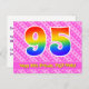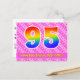L'avant de cette conception de carte postale d'anniversaire joyeuse, aimante et dynamique présente un grand nombre "95" avec un motif dégradé de spectre arc-en-ciel. Elle comporte également le message "Joyeux 95e Anniversaire" et un nom de destinataire personnalisable. L'avant présente en outre un motif rayé rose clair et rose foncé joyeux avec des formes de cœur. Le verso comporte un message de vœux d'anniversaire personnalisé, ou pourrait éventuellement être effacé et laissé vierge si un message doit être écrit à la main à la place. Une carte postale d'anniversaire comme celle-ci pourrait être un moyen amusant d'envoyer des vœux d'anniversaire à quelqu'un qui célèbre son quatre-vingt-quinzième anniversaire. Des cartes postales comme celle-ci pourraient également être utilisées pour inviter des invités à une célébration