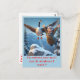 L'image représente une femme qui a récemment pris sa retraite et elle est heureuse parce qu'elle a beaucoup de temps libre, Elle saute en l'air en essayant de s'envoler avec une grande oie. L'atmosphère environnante, même si elle est froide en hiver, n'est pas un obstacle pour célébrer sa joie. Cette carte postale est personnalisable et vous pouvez modifier les textes comme vous le souhaitez.