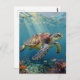 A sea turtle themed postcard with an illustration of a sea turtle under a calm teal sea swimming among the coral on the front.