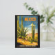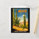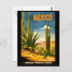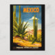Grande image d'une ancienne affiche de voyage pour le Mexique avec un cactus au premier plan et des maisons d'hacienda et des fleurs à l'arrière-plan.