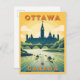 Affiche de voyage rétro d'ottawa canada avec la colline du parlement et des kayakistes sur la rivière