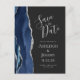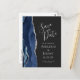 Cette élégante carte postale moderne à enregistrer la date comporte une bordure en aquarelle bleu marine ornée d'une parties scintillant en faux argent. Le texte personnalisable est gris argenté clair sur un arrière - plan gris fusain foncé. Le verso répète les informations, ainsi qu'une adresse de retour personnalisable.