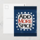 Un élément typographique gros et mignon qui dit "Ajoutez Plus d'Épice". Il comporte du texte noir et rouge sur un rectangle blanc entouré de points blancs funky et ludiques, le tout sur un fond bleu.