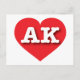 Cette carte postale est dotée d'un coeur rouge vif contenant les lettres coques supérieures blanches en gras AK, l'abréviation officielle de Alaska, la dernière frontière. Le verso de la carte postale est vide, en attendant votre texte customisé ou vos sentiments manuscrits.