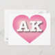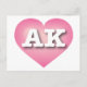 Cette carte postale est composée d'un coeur rose calme, cool et ramassé, avec un centre blanchi contenant les lettres coques supérieures blanches en gras AK, l'abréviation officielle de l'état de l'Alaska.