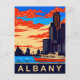 Carte postale Albany. Bateau à moteur sur la rivière Hudson et gratte-ciel derrière. Carte postale de voyage aux couleurs vives.