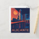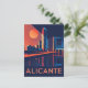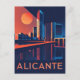 Illustration vibrante et colorée de l'horizon d'Alicante au coucher du soleil. L'image présente les gratte-ciel et les bâtiments emblématiques de la ville, en silhouette contre un ciel orange vif. L'eau reflète les teintes chaudes du coucher du soleil, créant une scène sereine et captivante.
