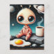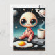 Un drôle d'Alien de bébé habillé en pjs roses avec un café du matin et un oeuf frit assis sur un rocher