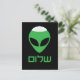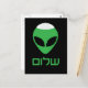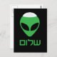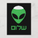 Tête d'alien vert avec de grands yeux portant un kippah/yarmulke avec "Shalom" en hébreu ci-dessous.